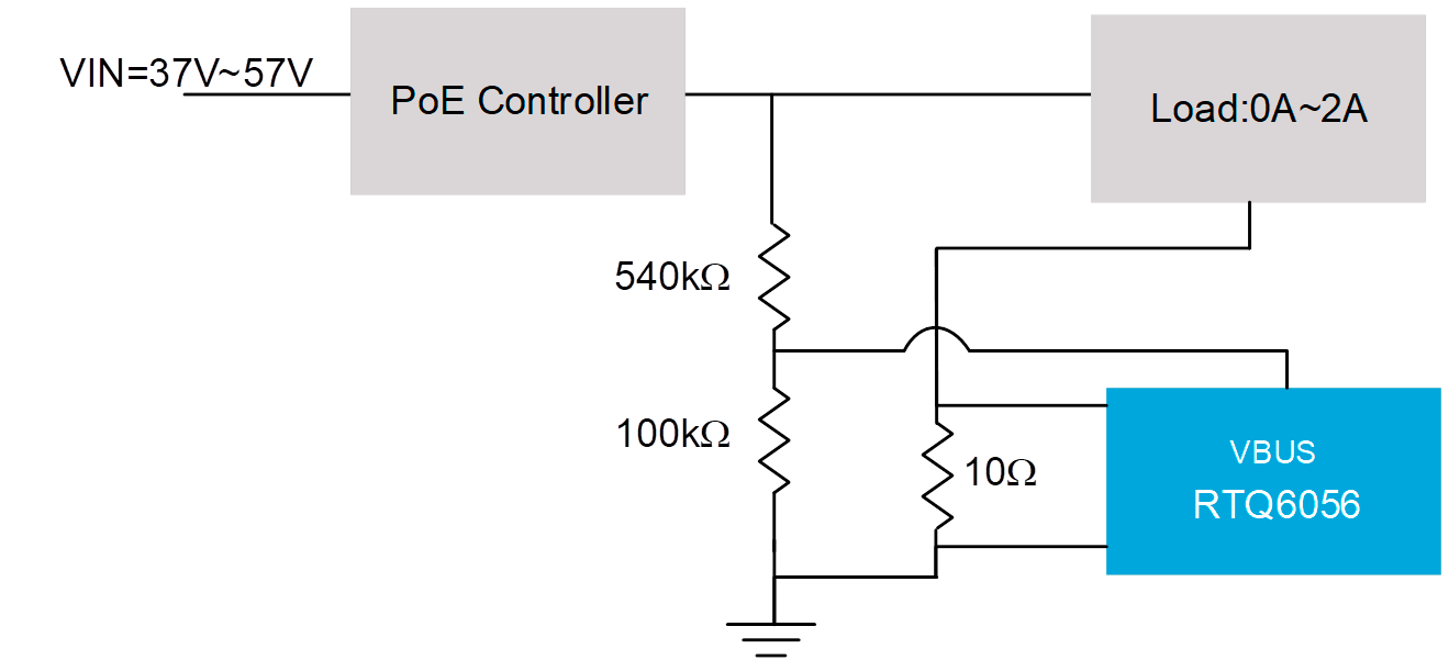 立锜 RTQ6056 可用于 PoE 输入的电源监控,如图 2 所示。由于 PoE 的输入电压范围为 37V 至 57V,而 RTQ6056 的最大操作电压仅支持到 36V,因此无法直接放在高压端。不过 RTQ6056 具备低压检测功能,因此将其配置于低压端来监控系统控制器,即可作为此应用的解决方案。