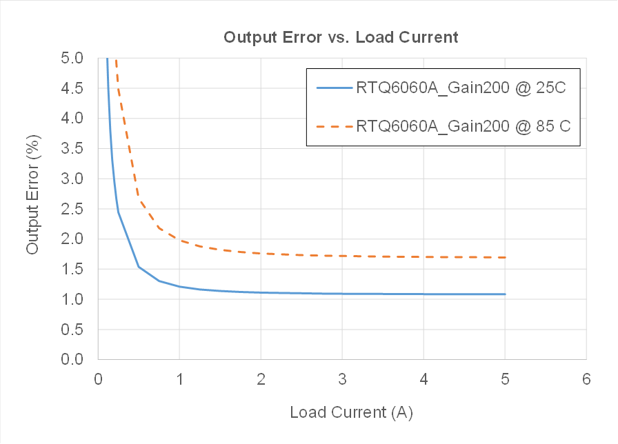 图 7 为 RTQ6060A 在 Gain=200 条件下的误差评估曲线 (error estimation curve)。可以看到,在常温下负载电流介于 3A 至 5A 时,量测误差仅约 1%。