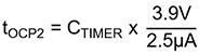 After power-up, the HSC needs to monitor the current for abnormal overcurrent events and protect the system. The RTQ1954 actively measures the load current by monitoring the voltage across RSNS. When the load current reaches IOCP2 threshold (IOCP2=VOCP2/RSNS), the fault timer starts by charging CTIMER with 2.5μA. If the current drops below the IOCP2 threshold before the fault timer reaches the fault timeout period (CTIMER voltage reaches 3.9V), the RTQ1954 resumes normal operation and CTIMER is discharged using 20μA. Otherwise, if the OCP2 lasts longer than the fault timeout period, the RTQ1954 turns off the external MOSFET and discharges CTIMER using 20μA. The tOCP2 fault timer is set by