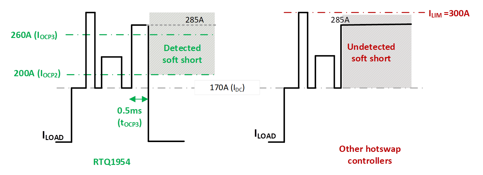 The RTQ1954 multi-level OCP solves this issue by covering a wide range of currents through OCP2 and OCP3. Therefore, any soft short current above OCP2 will be detected. This allows system thermal designers to design the board to withstand up to OCP2 current level, vs. designing it to withstand 2xIDC.