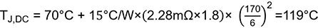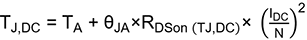 With the MOSFET RDSon strongly dependent on its junction temperature, a few iterations of the above equation may be needed to converge on the final values of RDSon and TJ,DC. According to the MOSFET datasheet, the RDSon increases by x1.8 at 120°C vs. 25°C, which leads to a TJ,DC that is close to the target value, and no further iterations are required.