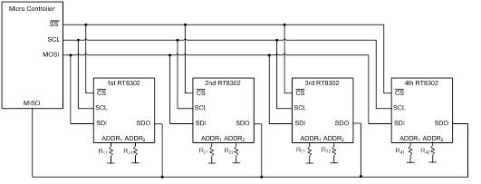為了達到區域調光,一般使用的I2C介面頻寬傳輸已不敷使用,例如4-CH, Programmable Current Sink LED Driver RT8302就是使用串列外設介面(Serial Peripheral Interface Bus, SPI)來作為訊號傳輸介面。