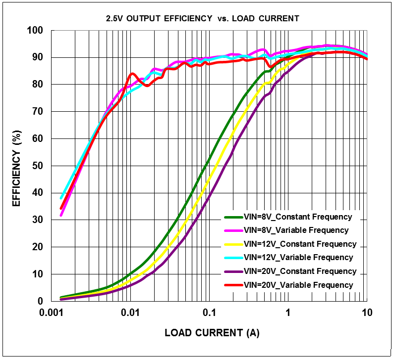 恒定导通时间控制的主要优点是它的轻载效率高。在非连续电流模式(DCM)下,恒定导通时间控制的开关频率与负载电流的大小成正比,如图五所示。轻载时的开关损耗为主要的损耗,所以轻载效率可藉由降低开关频率而得到改善,在图六可以看到在轻载条件下使用恒定导通时间控制可比使用定频控制达到更高的效率。