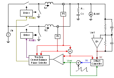 图二为 G-NAVP™ 架构的电路示意图。G-NAVP™ 架构是具有外部斜坡 (ramp) 和DC偏移消除的一种恒定导通时间之电流模式控制。具有有限DC增益的误差放大器 (EA) 可用来调整AVP负载线,并对极点和零点进行补偿。电流信号是透过 DCR 电流检测网络,并用外部斜坡 (ramp) 和 comp信号来调变,其中加上外部斜坡 (ramp) 是为了增加噪声抑制能力。导通时间产生器 (on-time generator) 将随输入和输出电压自动改变导通时间,以使电感器电流纹波在整个输入 / 输出范围内都保持恒定。为能有更精确的输出电压,在回路中加上DC偏移消除功能以消除纹波偏移电压。上述提及的功能不仅增加CPU电源控制器的稳健性和精确度,而且能保有良好的瞬态响应性能。