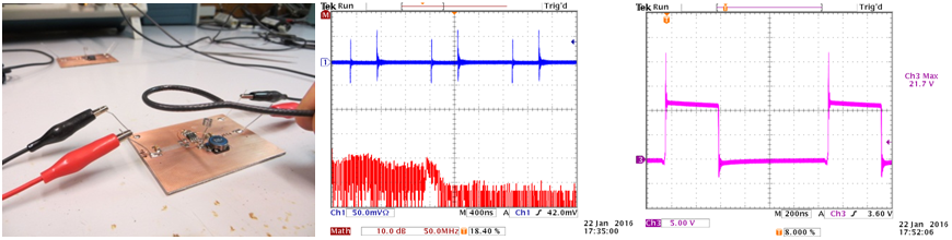 在此实验中,我们使用双面PCB,输入电容的放置位置如上面的实验2一样,这样的配置可以在输入回路中引入比较明显的辐射。