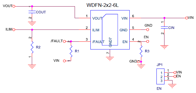2. Set the jumper at JP1 to connect terminals 1 and 2, connecting EN to VIN. The Enable pin can connected to VIN directly as well to enable operation.