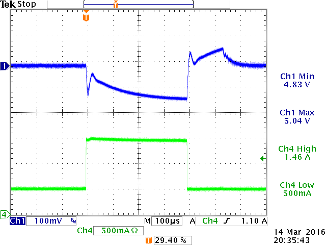 在28V输入条件下,转换器因为触及最短导通时间而进入脉冲跨越状态,这导致较高的输出电压纹波,这没有在仿真中呈现出来。同样的状况在输入电压很低时也会表现出来,这时的转换器进入100%占空比状态,输出电压无法再实现自动调节,它将跟随VIN的变化,其间的差等于电流流过RDSON和电感器的直流电阻DCR所形成的电压差。此时发生的任何振荡过程都是电感和电容的谐振造成的,与转换器的稳定性没有关系。实际量测到的100%占空比情况下的输出波形与仿真输出的波形有些不同,因为在仿真中的电源是理想电源,而用于实际量测的电源不是理想的。非理想的电源在遇到负载瞬变时会出现电压下坠现象,而这种变化会被反映到转换器的输出上。