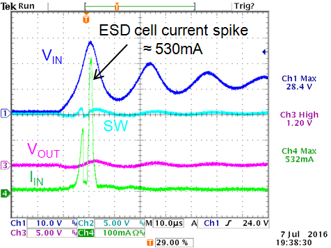 电流尖峰的持续时间大约为1.8µs,在失效前通过ESD单元的能量大约为0.6A*1.8µs*29V = 31µJ,比2kV人体模式ESD脉冲带来的能量多5倍以上。