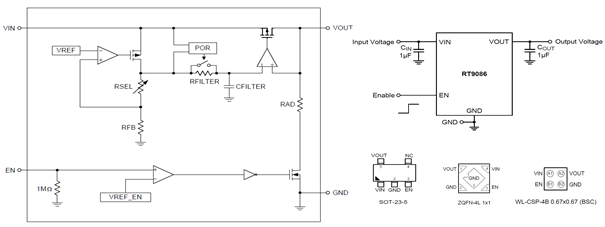 - Small Size : WL-CSP-6B 1.415x0.885mm2, WDFN-6L 2x2mm2