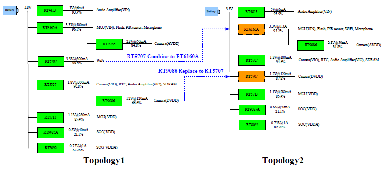 For 1.2V power rail, replacing RT9085A with RT5707 can improve efficiency from 66.6% to 87.8%, which saved 52.2mW in this rail.