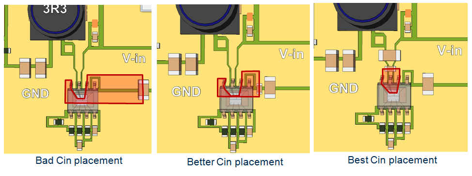 輸入電流I1的dI/dt非常高,可能在廣泛的頻譜範圍內產生大量的電磁干擾(EMI)。如圖1所示,應盡可能地將面積 A1降至最小。Cin應盡可能地靠近IC的VIN引腳和GND引腳之間放置,詳見圖2。