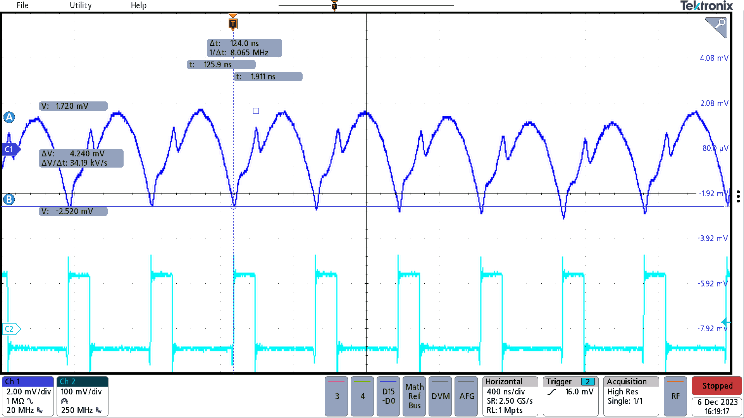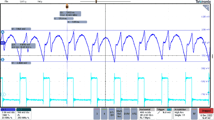 以下的測量顯示了加上60kHz輸入信號的CH1和CH2信號輸出。信號的振幅將影響切換信號的占空比變化。我們設定了19mVpp的插入信號振幅。由於信號中的雜訊較低,信號雜訊比例看起來是正常的。