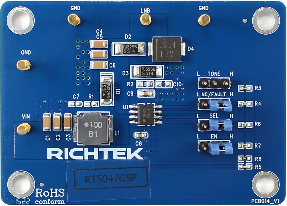 The RT5047 is a highly integrated voltage regulator and interface IC, specifically design for supplying power and control signals from advanced satellite set-top box (STB) modules to the LNB down-converter in the antenna dish or to the multi-switch box. This document explains the function and use of the RT5047 evaluation board (EVB), and provides information to enable operation, modification of the evaluation board and circuit to suit individual requirements.