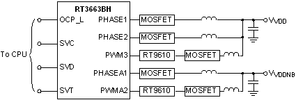 The RT3663BH is a 3 + 2 phases PWM controller, and is compliant with AMD SVI2 Voltage Regulator Specification to support both CPU core (VDD) and Northbridge portion of the CPU (VDDNB). The RT3663BH features CCRCOT (Constant Current Ripple Constant On-Time) with G-NAVP (Green-Native AVP), which is Richtek's proprietary topology. The G-NAVP makes it an easy setting controller to meet all AMD AVP (Adaptive Voltage Positioning) VDD/VDDNB requirements. The droop is easily programmed by setting the DC gain of the error amplifier. With proper compensation, the load transient response can achieve optimized AVP performance. The controller also uses the interface to issue VOTF Complete and to send digitally encoded voltage and current values for the VDD and VDDNB domains. It can operate in single phase and diode emulation mode and reach up to 90% efficiency in different modes according to different loading conditions. The RT3663BH provides special purpose offset capabilities by pin setting. The RT3663BH also provides power good indication, over-current indication (OCP_L) and dual OCP mechanism for AMD SVI2 CPU core and NB. It also features complete fault protection functions including over-voltage, under-voltage and negative-voltage protections.