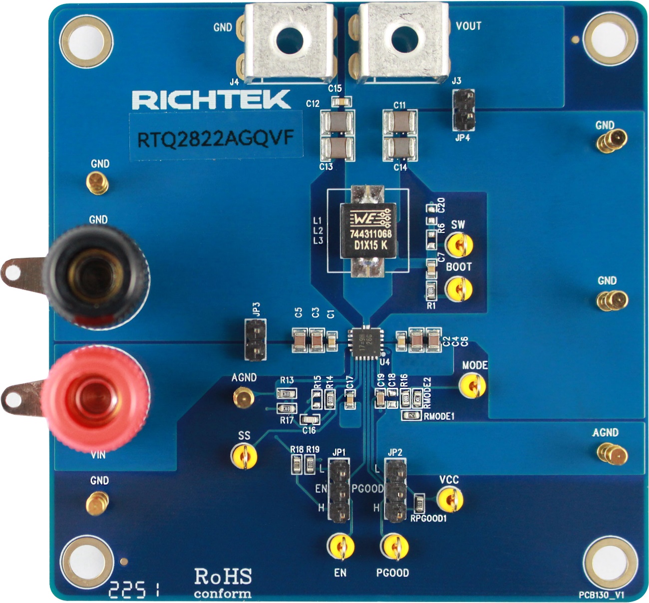This document explains the function and use of the RTQ2822A evaluation board (EVB), the RTQ2822A is a high-performance, synchronous step-down converter that can deliver up to 12A output currentvwith an input supply voltage range of 4.5V to 17V. The device integrates low RDS(ON) power MOSFETs, accurate 0.6V reference and an integrated diode for bootstrap circuit to offer a very compact solution. This document explains the function and use of the RTQ2822A evaluation board (EVB), and provides information to enable operation, modification of the evaluation board and circuit to meet individual requirements.