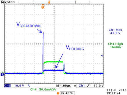 40V SCR ESD 单元在曲线测试仪上的表现